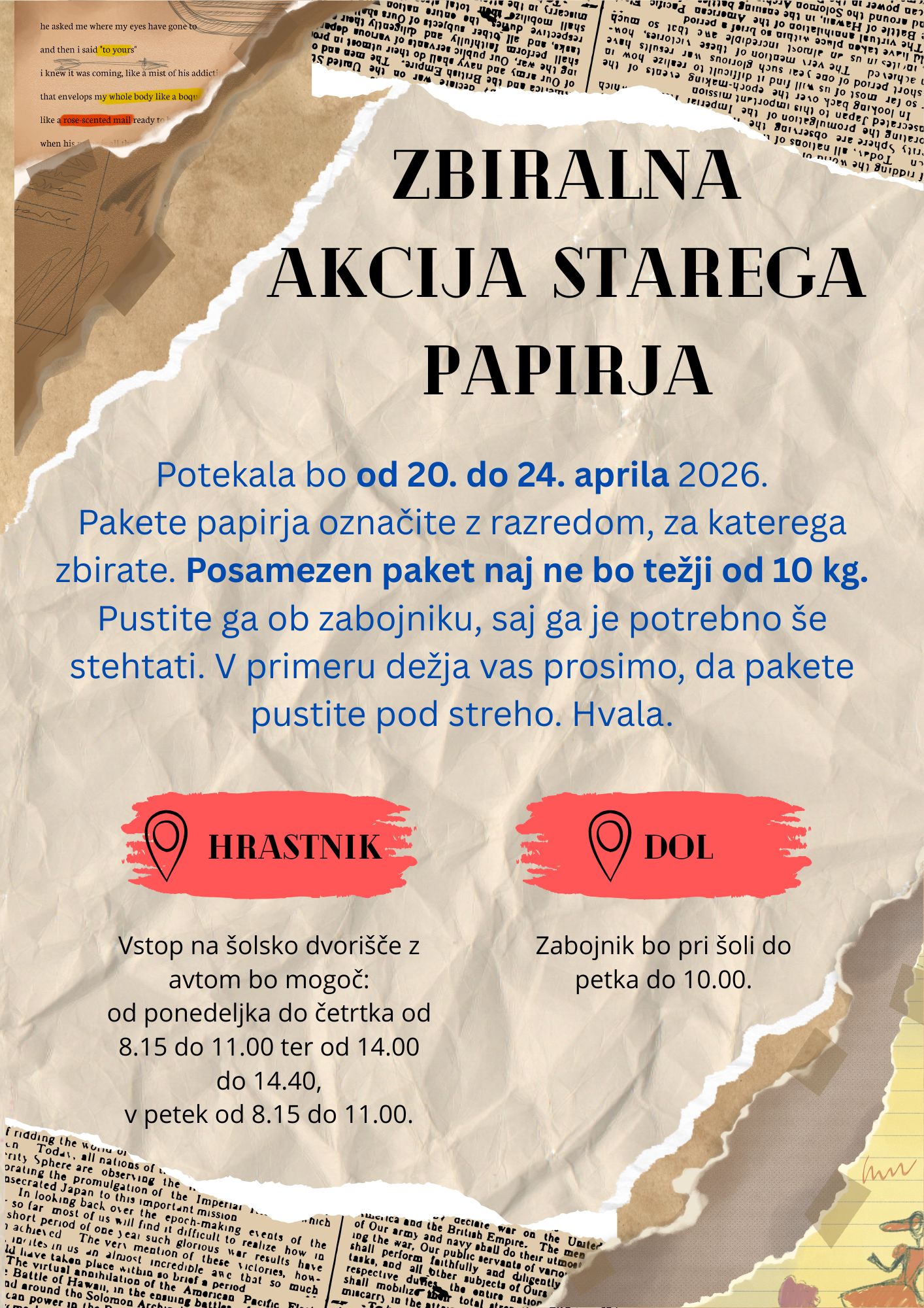 Potekala bo od 20. do 24. aprila 2026. Pakete papirja označite z razredom, za katerega zbirate. Posamezen paket naj ne bo težji od 10 kg. Pustite ga ob zabojniku, saj ga je potrebno še stehtati. V primeru dežja vas prosimo, da pakete pustite pod streho. Hvala.